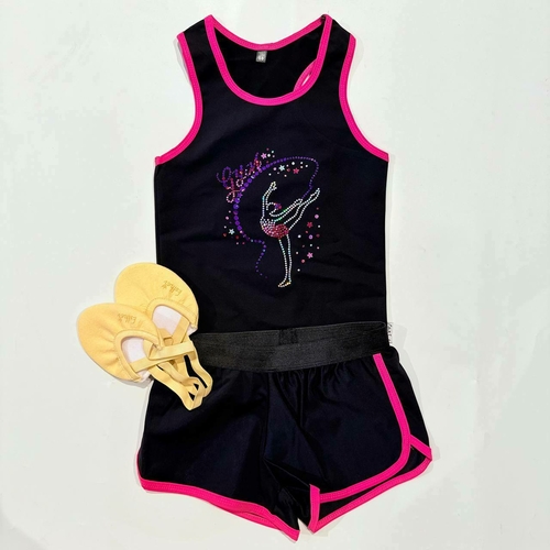 Black top with pink ending and print: